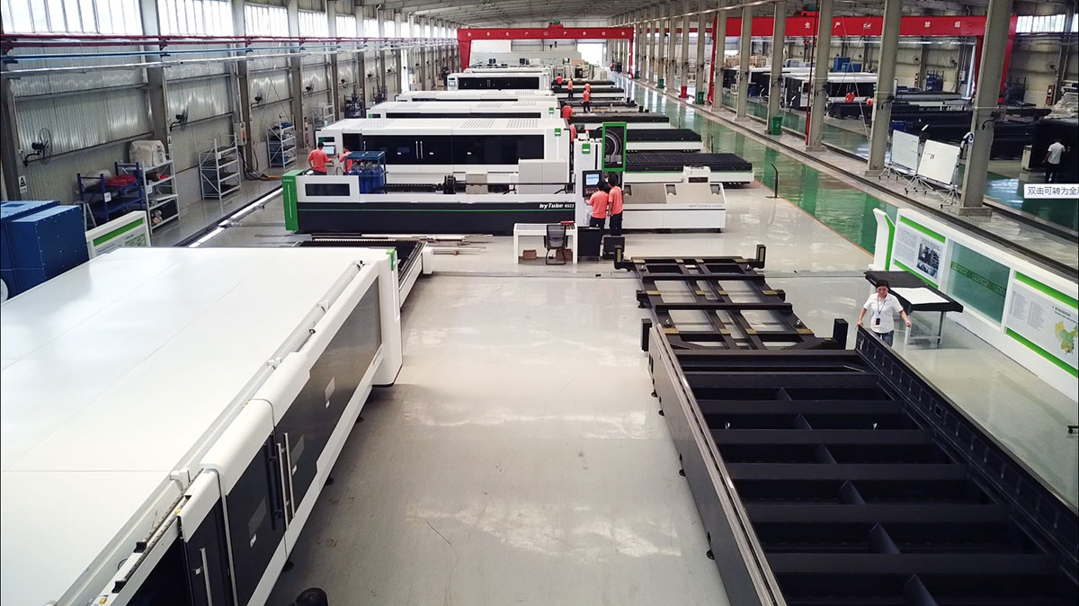 在卓总的陪同下,长堀先生一行先后参观了徐州生产基地的钢材开料车间、机床焊接车间、精密机械加工车间、热处理车间、大型机床龙门加工车间和金属激光切割设备整机装配调试车间等。在参观过程中,卓总向长堀先生介绍,自2021年以来,大族粤铭激光集团一次性向徐州生产基地追加投资1亿元人民币,新建了现代化智能生产车间35000平米,购置了数十台套行业内领先的智能化龙门数控加工中心、机床喷涂生产线、热处理设备和精密机械加工设备,招聘并精心培养了100多名熟练的高素质技术工人。从而使徐州生产基地具备了大型金属激光切割装备从开料、焊接、热处理、机加工、表面喷涂到整机装配与调试的全流程自有可控的大批量生产制造能力,建立起了全流程可掌控的产品质量管理体系,从根本上确保了松谷智能装备金属激光切割装备的快速交付能力和过硬的产品品质,为徐州生产基地后期的高质量发展奠定了坚实的基础。