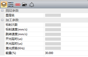 正常开机后,将能量调至30%以下,其余参数不变(操作界面如下图所示),空打出光预热约10分钟,再进行生产加工。