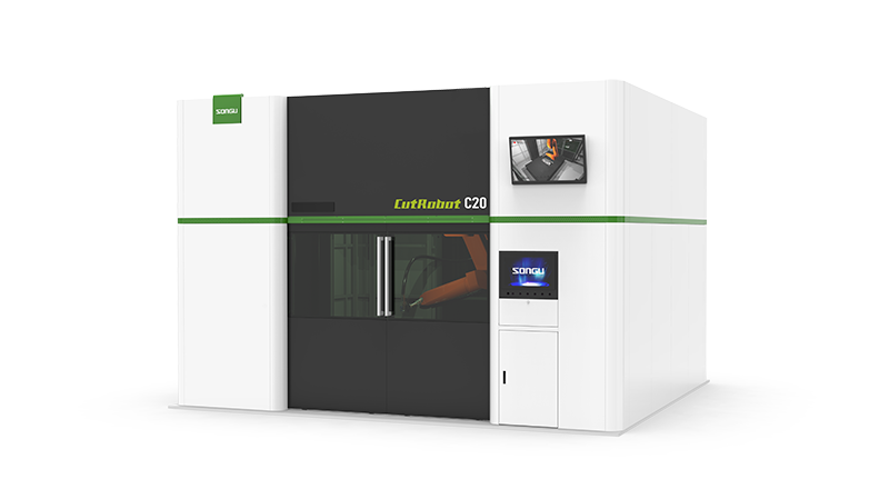 高精度工业机器人,全铝合金手臂,重量轻;机器人采用龙门式吊 挂安装,工作范围大,装卸区接近性好,可以加工大型钣金成型件;
